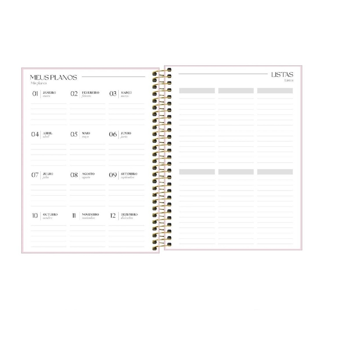 O produto tem tamanho 17,7 x 24 cm, capa dura revestida com material especial para oferecer visual sofisticado, bolsa plástica, folhas com visão de um dia por página, exceto aos sábados e domingos, e pautas com horário entre 7h e 22h.