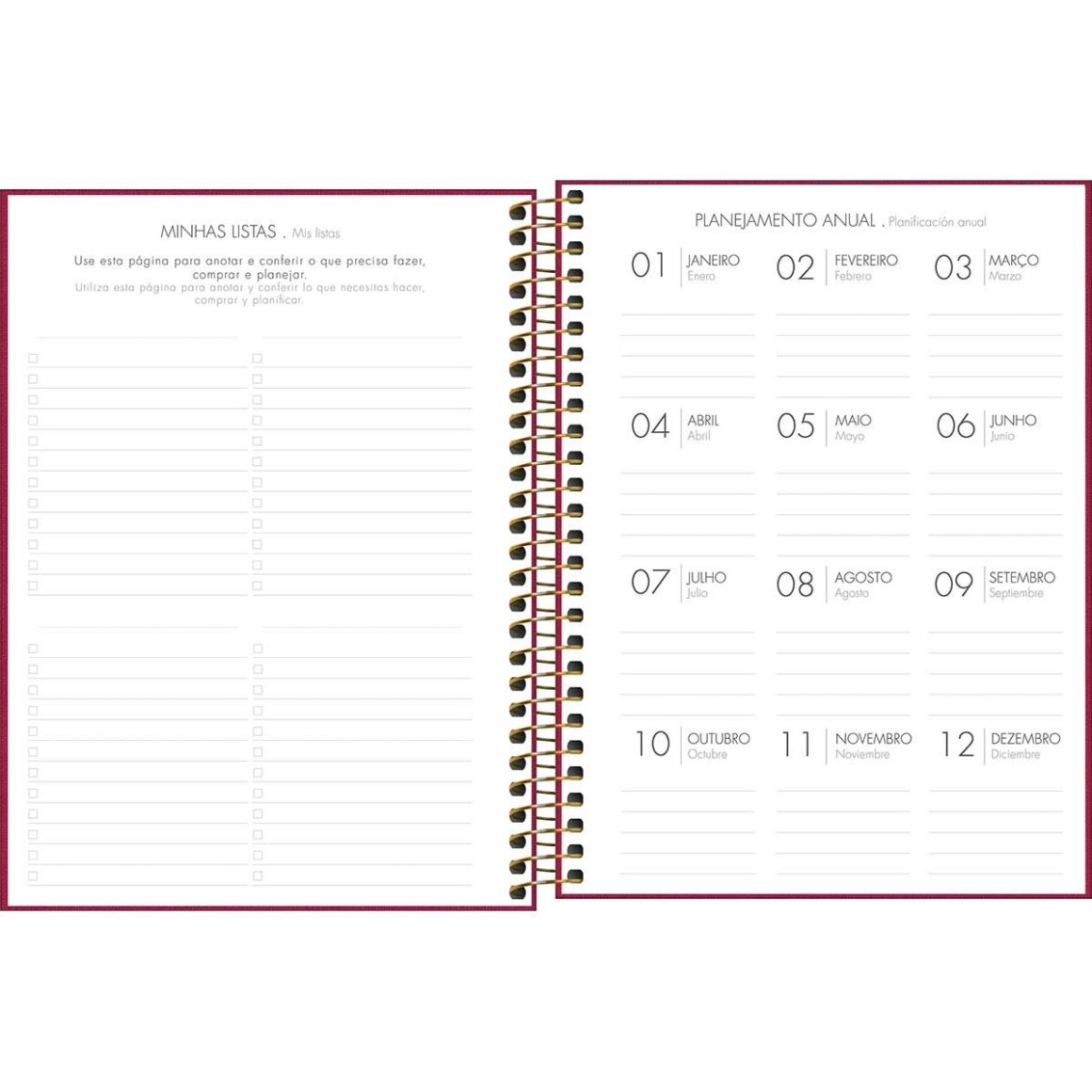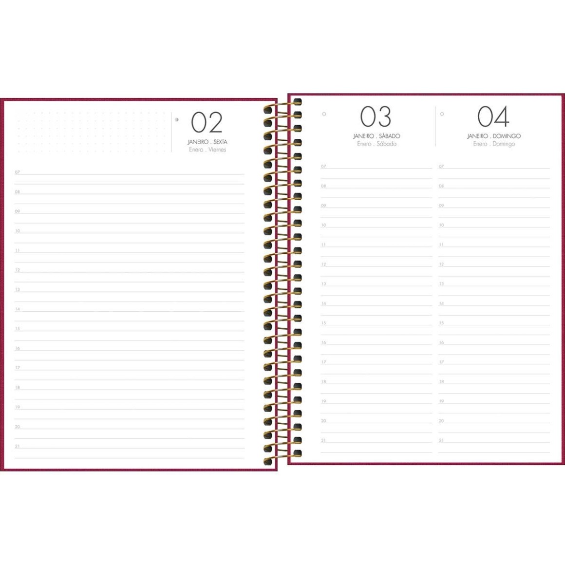 O produto tem tamanho 17,7 x 24 cm, capa dura revestida com material especial texturizado para oferecer visual sofisticado, bolsa plástica, folhas com visão de um dia por página, exceto aos sábados e domingos, e pautas com horário entre 7h e 21h.