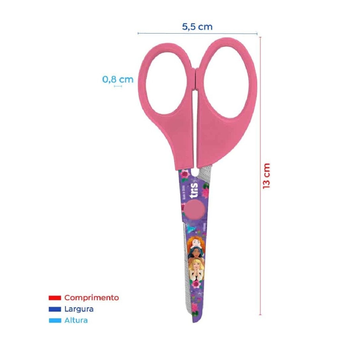 Com pontas arredondadas e cabo resistente em PP, a tesoura Princesas possui as lâminas decoradas, 13cm de comprimento total e 1,5mm de espessura de lâmina.
