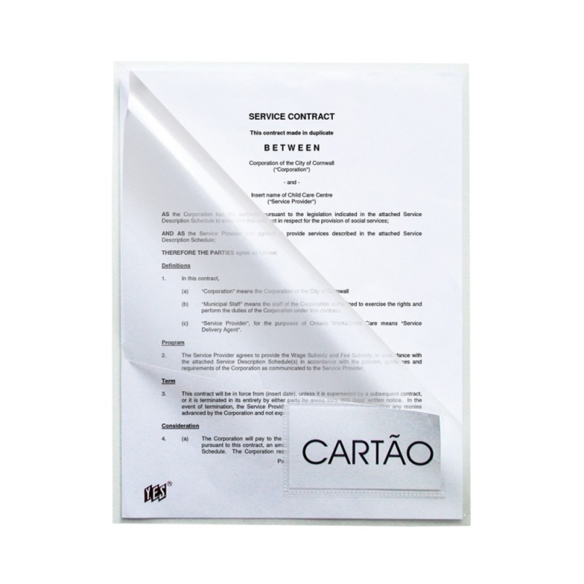 Pasta L com porta cartão, tamanho A4, chapa Transparente que não adere ao impresso. Corte em meia lua na borda para facilitar manuseio. Material leve, atóxico, bastante resistente e 100% reciclável. Embalagem com 10 unidades.